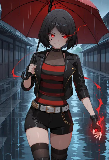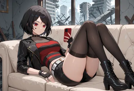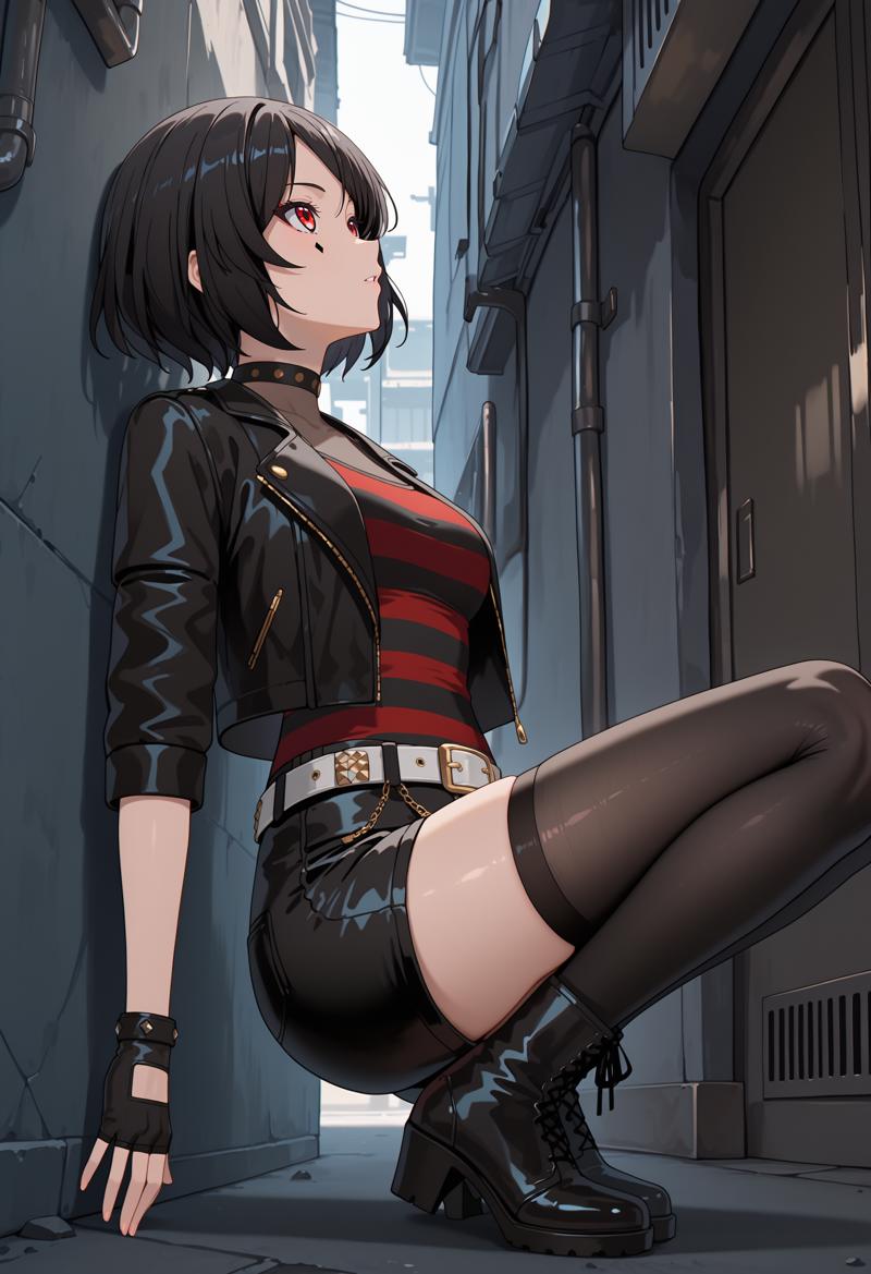 black jacket, leather, striped shirt, black shorts, white belt, see-through collarbone, fingerless gloves, black thighhighs, black boots,