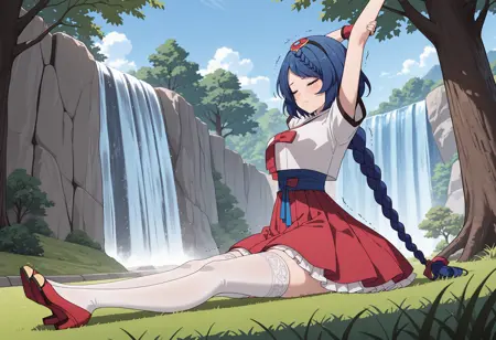 asemi, blue hair, braid, blue eyes, swept bangs, red hairornament, black hairband,