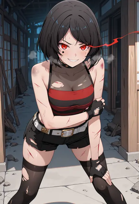 csemi, black hair, short hair, red eyes, swept bangs, facial mark,