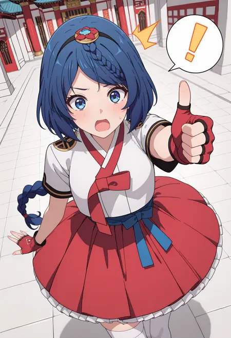 hanbok, white shirt, short sleeves, red skirt, white thighhighs, red gloves, fingerless gloves,