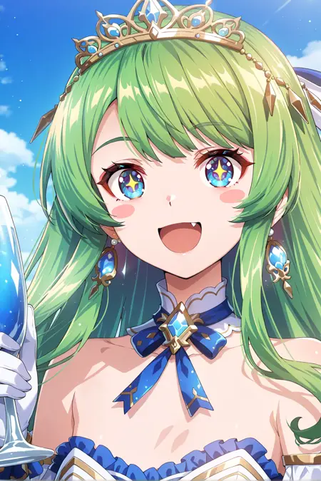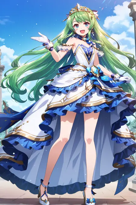 blue eyes, blush stickers, flat chest, green hair, fang, long hair, tiara, earrings, neckwear, gloves, blue and white frilled dress, skirt, high heels