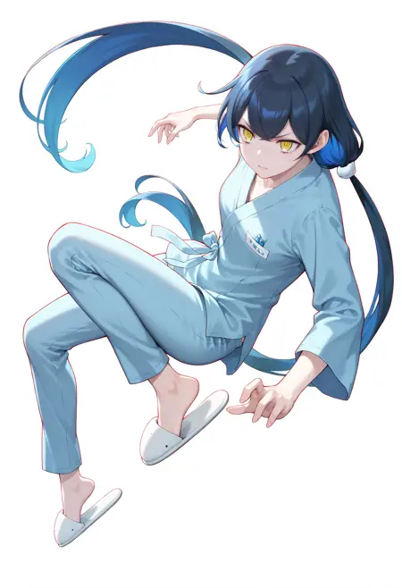 外見: 1girl、黄色い目、黒髪、前髪、(青髪:1.2)、目の間の髪、輪状の目、V字眉、長い髪、とても長い髪、ツインテール、複色髪、グラデーション髪、低めのツインテール、(金髪:0.8)、ツートーン髪、流れた前髪