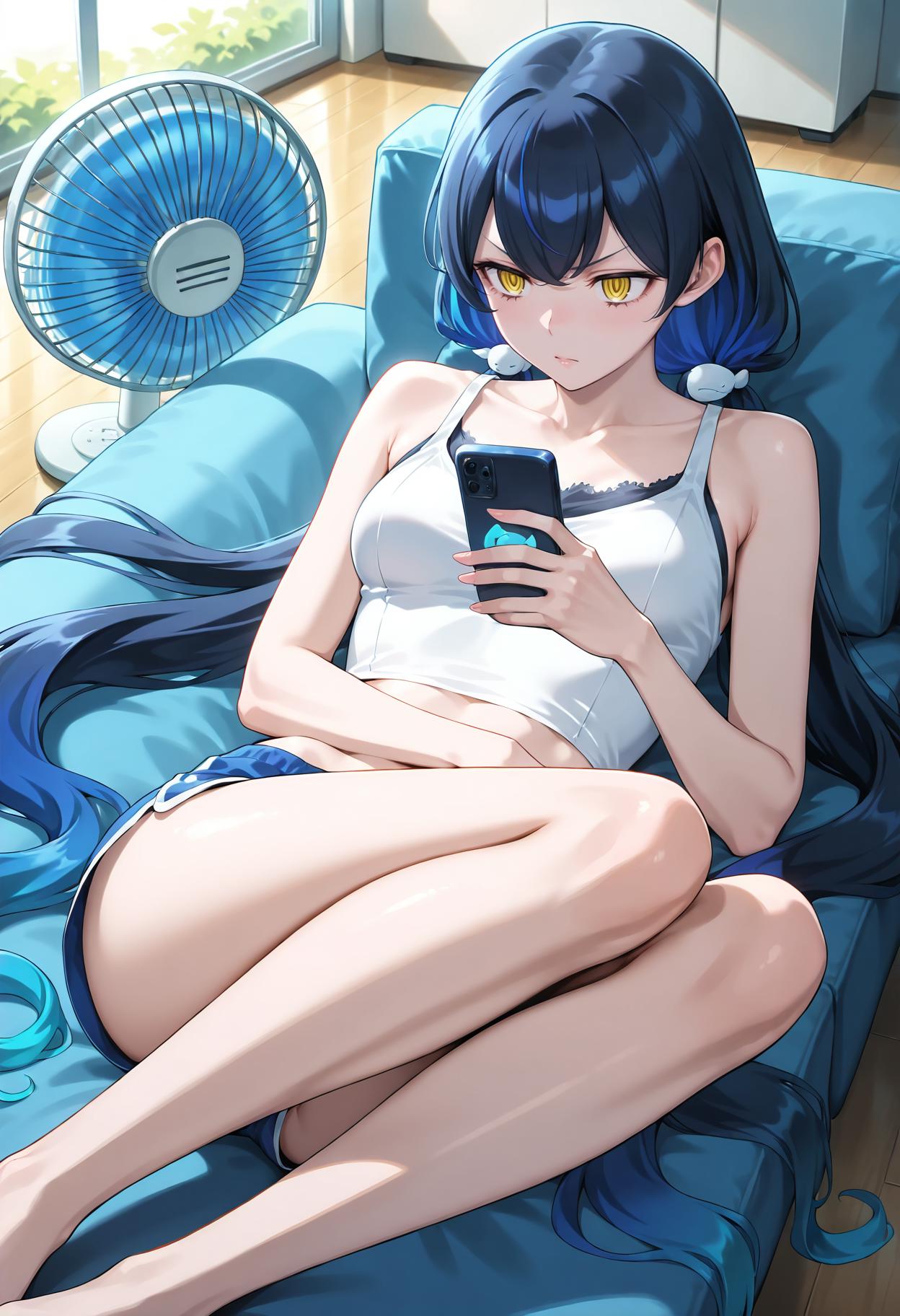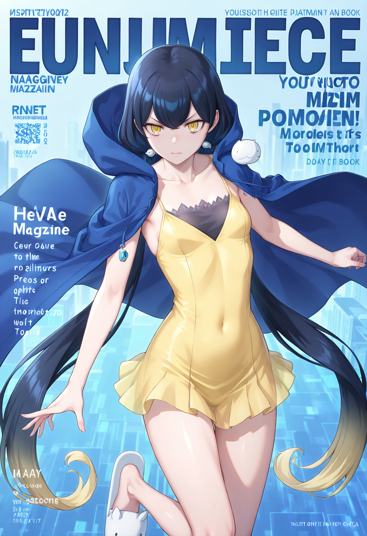 Appearance: 1girl, yellow eyes, black hair, bangs, (blue hair:1.2), hair between eyes, ringed eyes, v-shaped eyebrows,long hair, very long hair, twintails,multicolored hair,gradient hair, low twintails,(blonde hair:0.8), two-tone hair, swept bangs