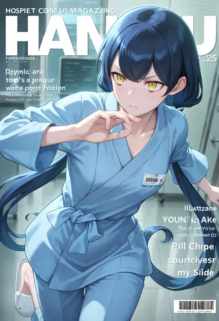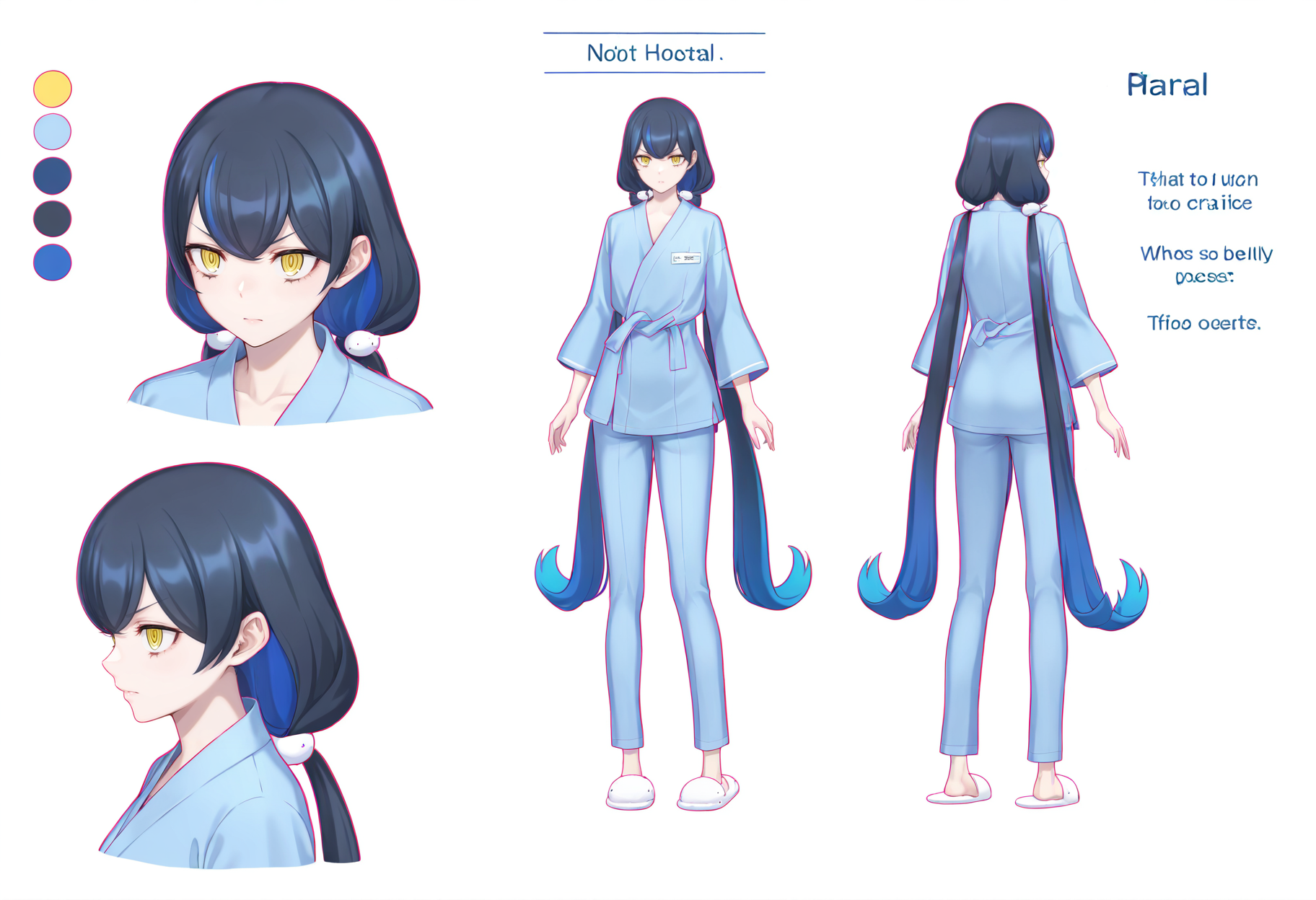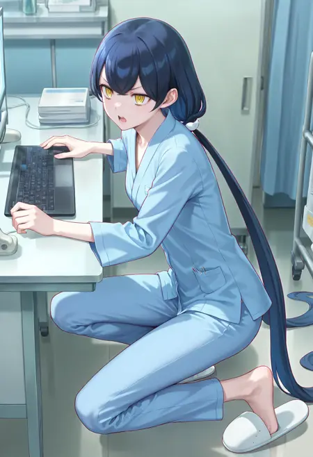 Hospital Outfit: slippers, pajamas,hospital gown, pants, long sleeves, white footwear, blue pants