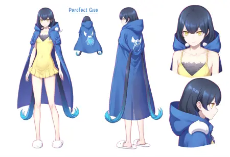 草案の服: ドレス、青いマント、フード、鎖骨、スリッパ、黄色いドレス、フードを下ろした状態、ノースリーブのドレス、短いドレス、ノースリーブ、足を露出、マント、胸、白い靴、腕を露出、動物スリッパ、パンツ、レース縁のドレス、下着、小さな胸、フード付きのマント、マント、レース縁、レース、肩を露出、フード付きマント、透けている