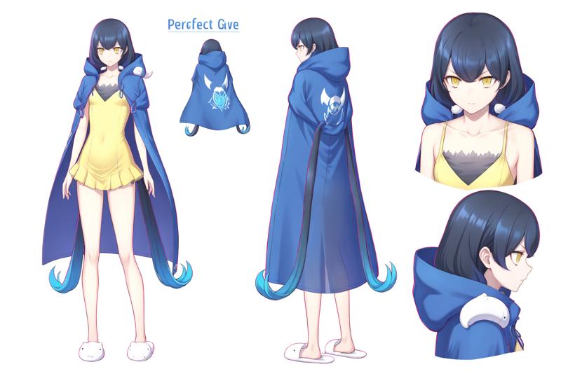 Draft Outfit: dress, blue cape, hood, collarbone, slippers, yellow dress, hood down, sleeveless dress, short dress, sleeveless, bare legs, cape, breasts, white footwear, bare arms, animal slippers, panties, lace-trimmed dress, underwear, small breasts, hooded cloak, cloak, lace trim, lace, bare shoulders, hooded cape, see-through
