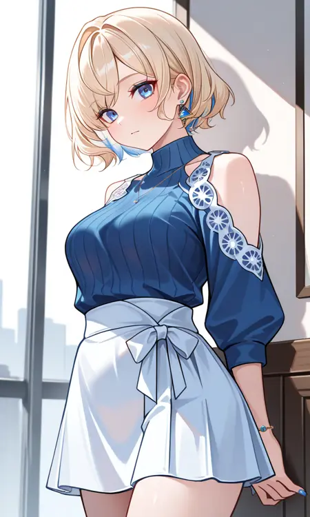 Lawson outfit : gloirelsKC, short hair, skirt, shirt, bare shoulders, jewelry, earrings, nail polish, clothing cutout, white skirt, blue shirt, blue nails, shoulder cutout
