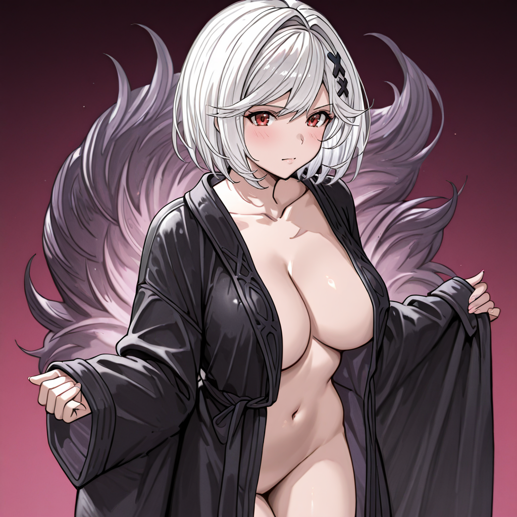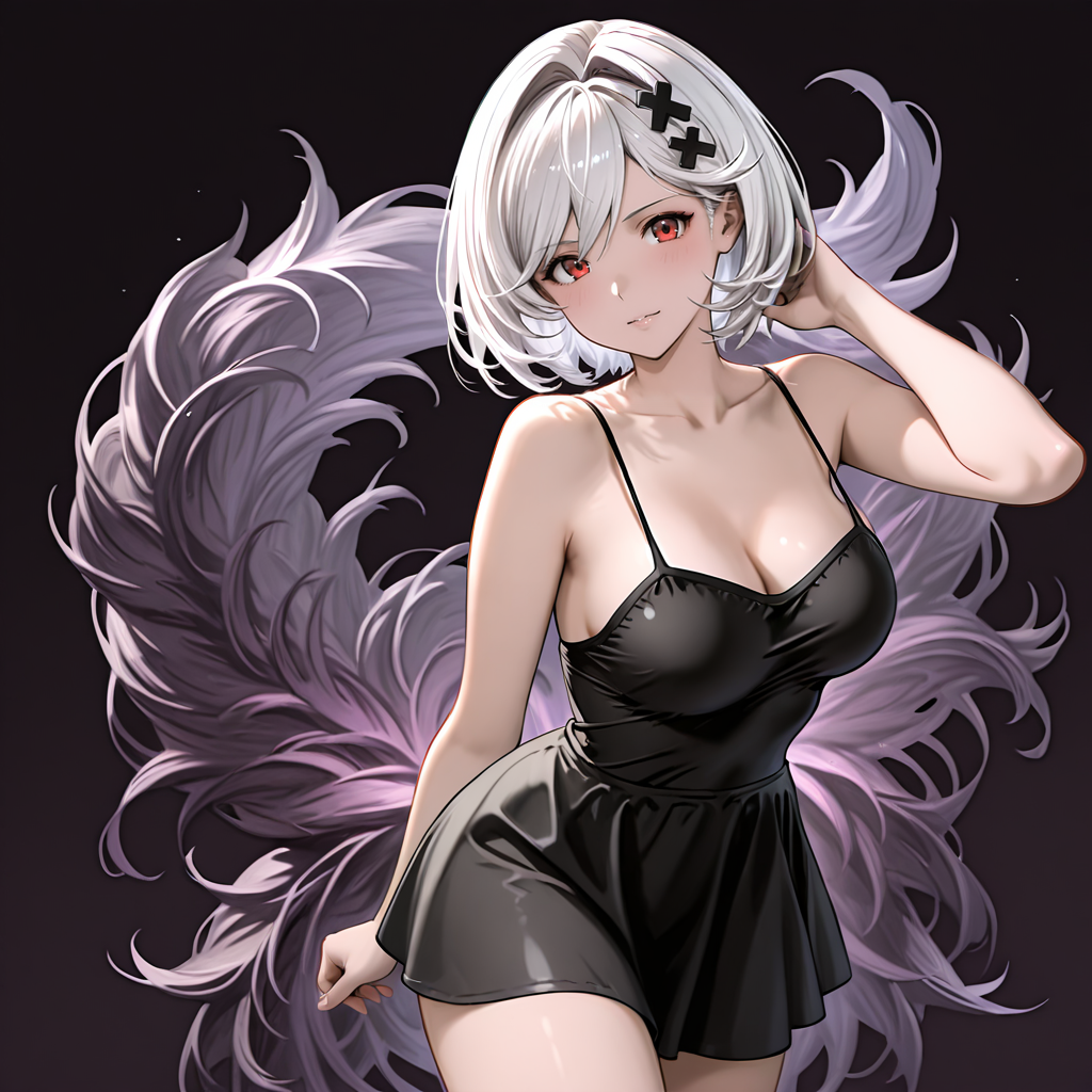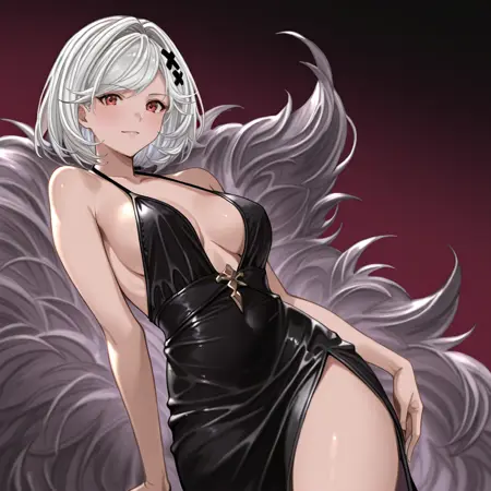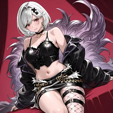 Trigger with Alter Ego Malevolent: DjeetaAlterEgoMalevolent, 1girl, djeeta (granblue fantasy), red eyes, fishnets, black skirt, navel, midriff, x hair ornament, black choker, short hair, black jacket, feather boa, belt, breasts, white hair, miniskirt, off shoulder, bare shoulders, crop top, fishnet thighhighs, jewelry, earrings, open clothes, single thighhigh, thigh strap, open jacket, collarbone, long sleeves, camisole, fur trim, bangs, black shirt