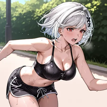 Trigger without coat: DjeetaWithoutCoat, 1girl, large breasts, djeeta (granblue fantasy), red shorts, blonde hair, navel, clothing cutout, cleavage cutout, short shorts, hairband, hair ornament, crop top, brown eyes, short hair, midriff, black shirt, sleeveless shirt, bangs, jewelry, thighs, bare shoulders