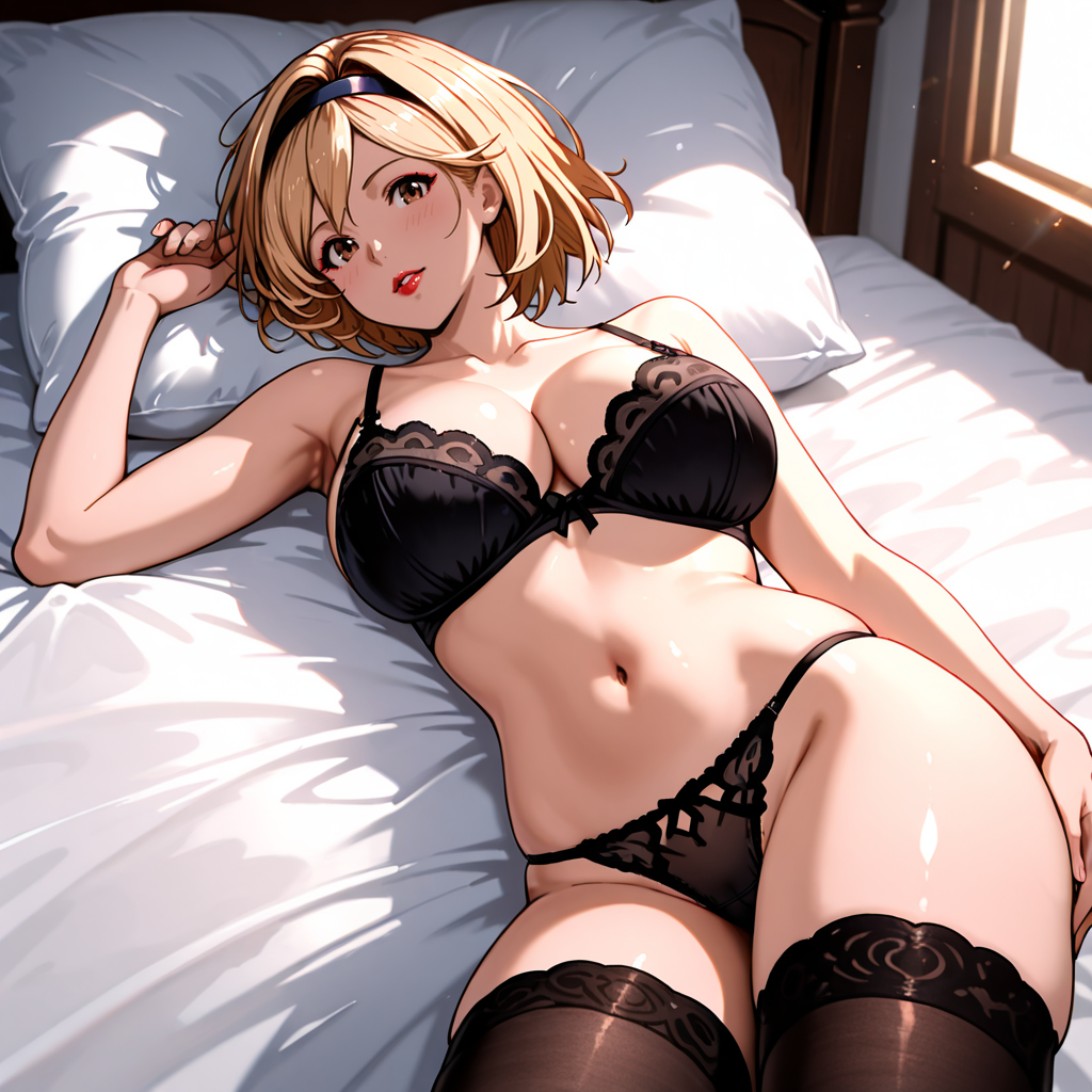 Trigger : Djeeta, 1girl, djeeta (granblue fantasy), navel, clothing cutout, cleavage cutout, short hair, short shorts, blonde hair, medium breasts, cape, midriff, black gloves, brown eyes, red shorts, hairband, hair ornament, groin, thighhighs, feathers, armor, belt