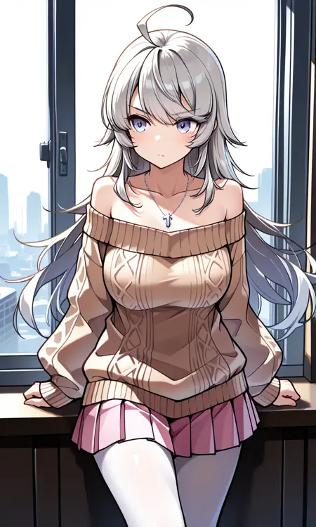 Valentine outfit : washingtonvalentainKC,long hair,skirt, long sleeves, bare shoulders,jewelry, ahoge, pantyhose, pleated skirt, necklace, sweater, pink skirt, white pantyhose,brown sweater,off shoulders,collarbone,