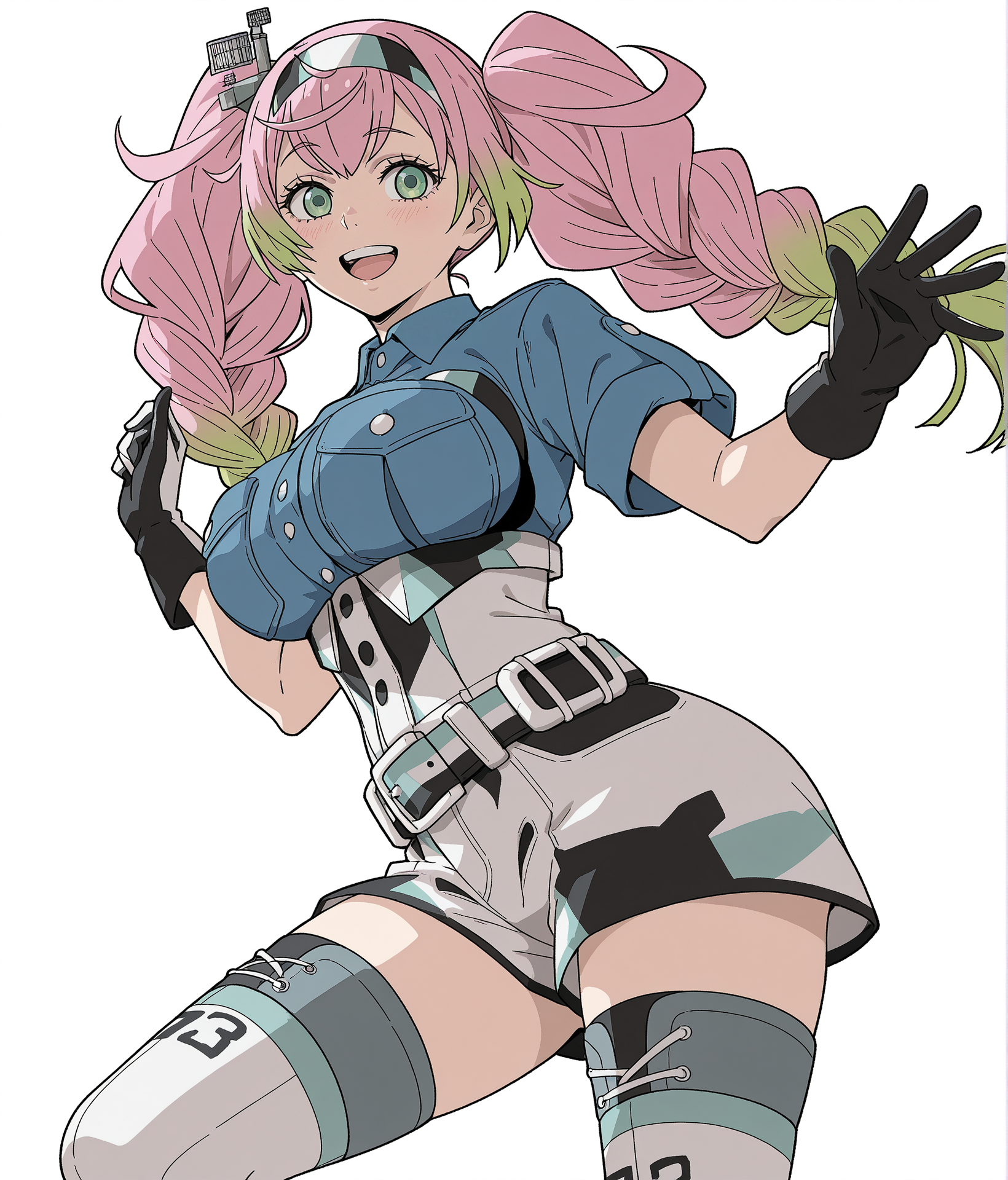 다색 헤어밴드, 셔츠, 장갑, 다색 장갑, 반팔, 헤어밴드, 가슴 주머니, 검은 장갑, 칼라 셔츠, 다색 옷, 주머니, 단추, 머리 장식, 파란 셔츠,