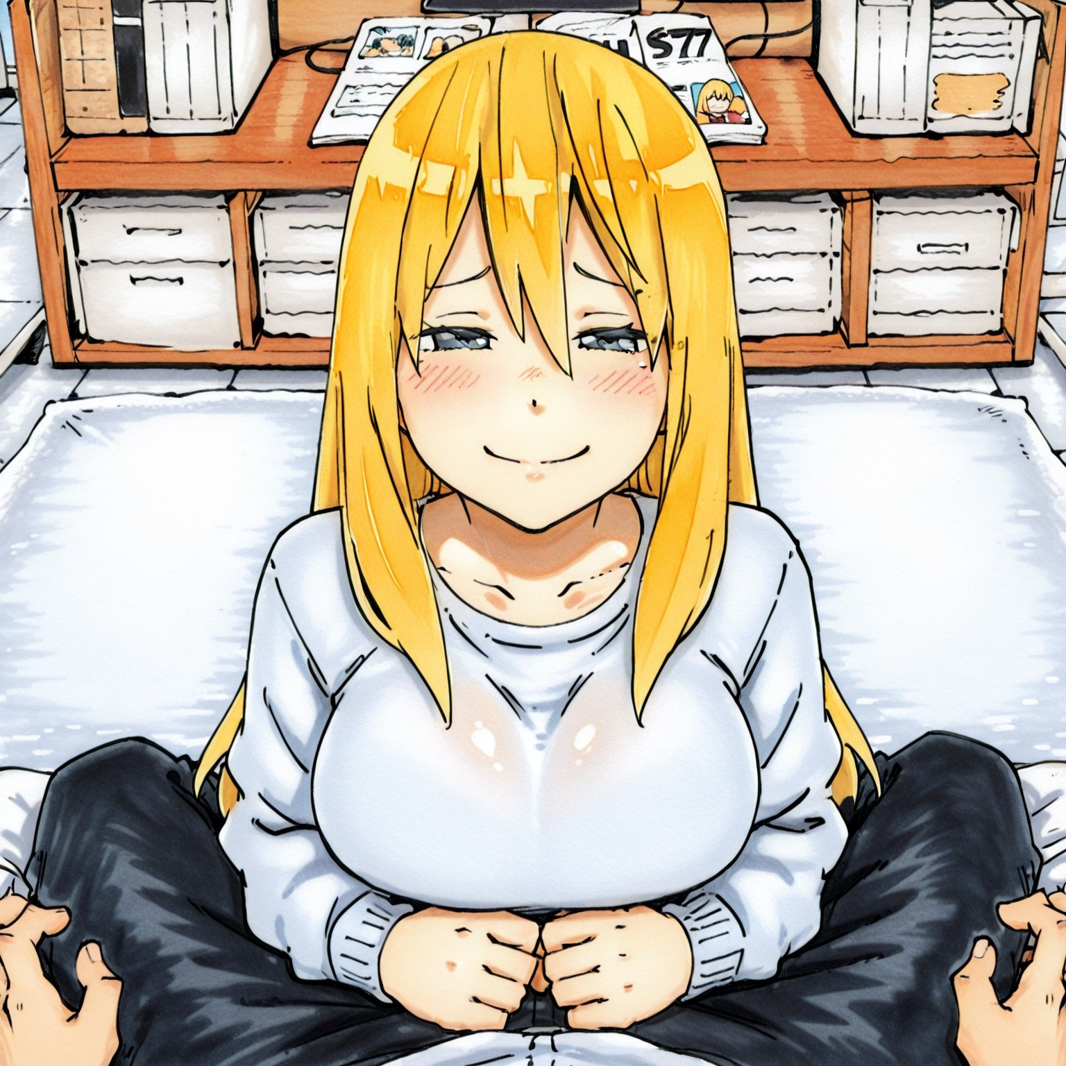 haruko ishii, sweat shirt, sweat pants, blond hair, hair between eyes, neet, traditional media long hair