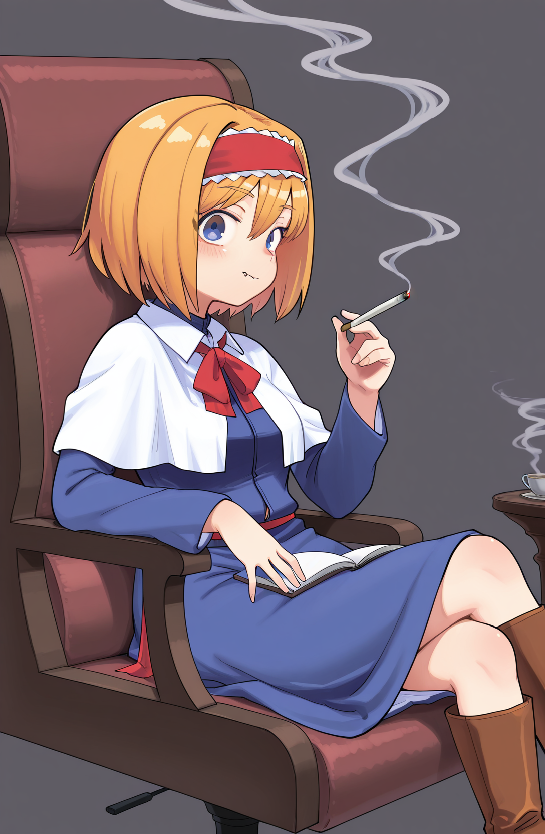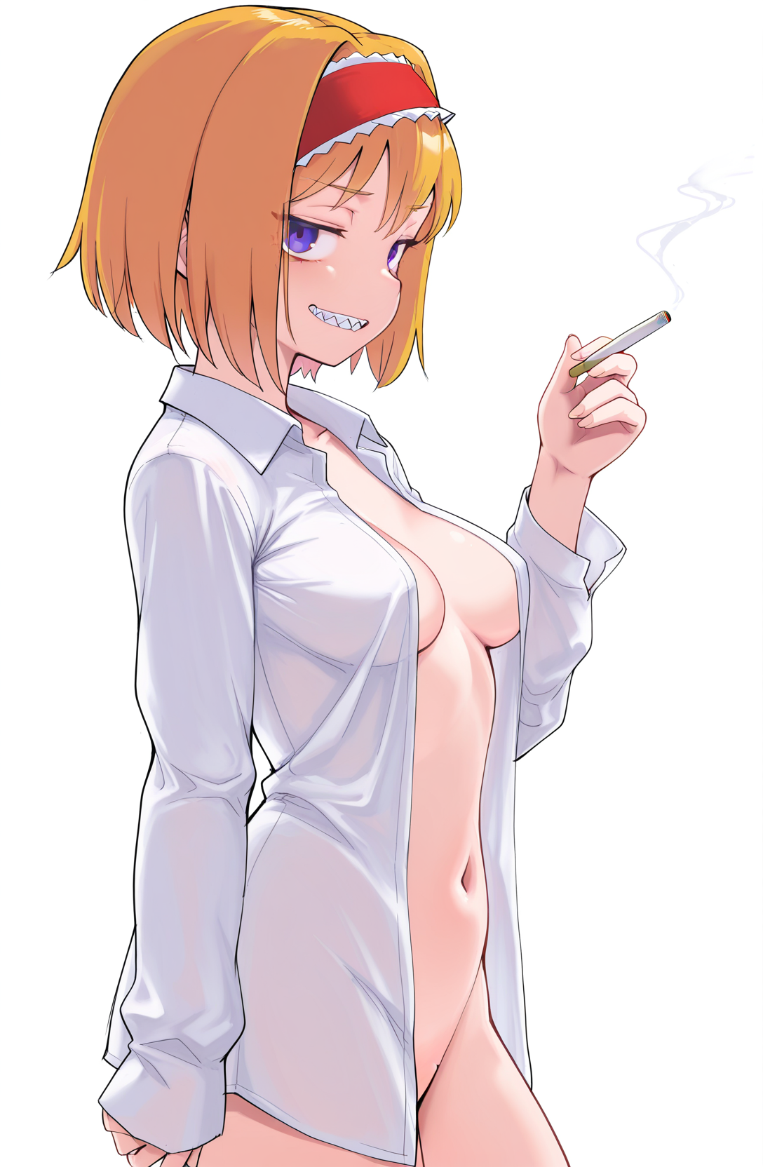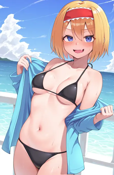 Body,face : [ taisa \(cookie\), blue eyes, blonde hair, short hair, bangs, hair between eyes,alice margatroid ] option : [ sharp teeth, fang ]