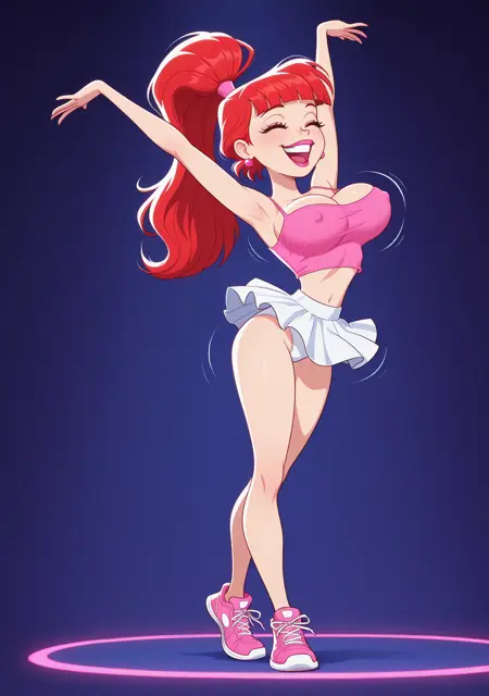 starbar_adbimbo, 1girl, solo, 赤毛, ポニーテール, 長髪, 前髪, ピアス, リップストップ, ピンクのキャミソール, 大きな胸, 胸元, 腹部, 白いミニスカート, ピンクのスニーカー