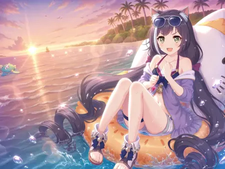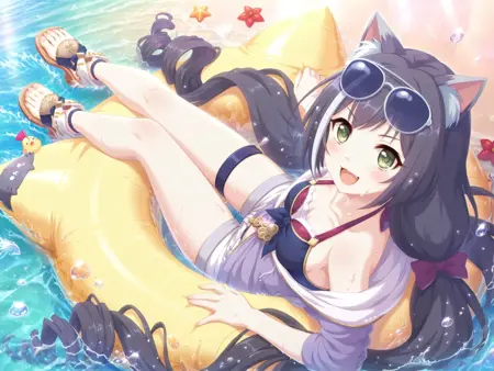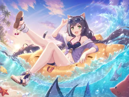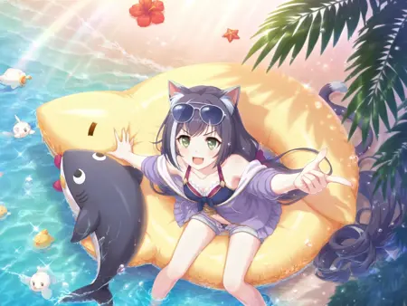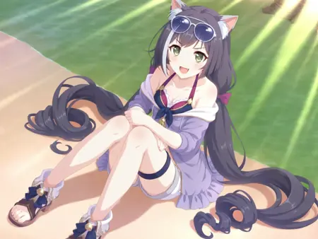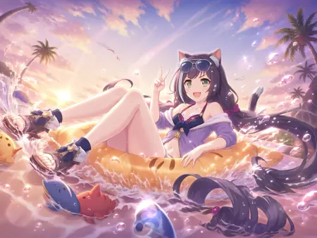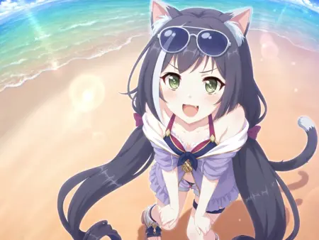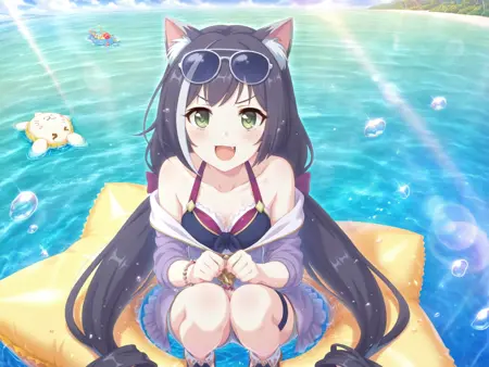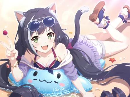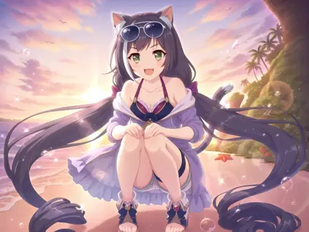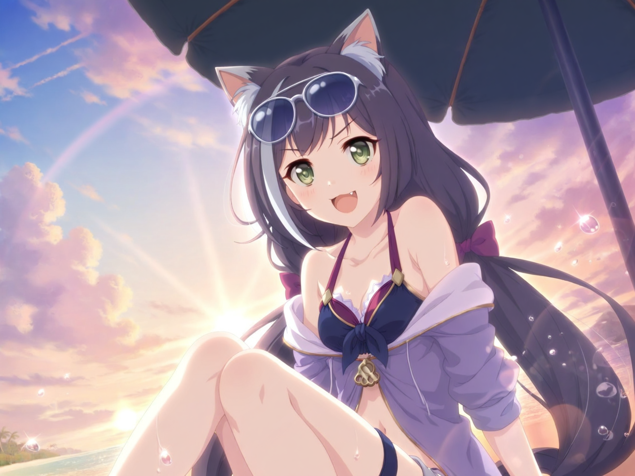 more details,incredibly absurdres,lora:Karyl5464:0.9,karyl \(summer\) \(princess connect!\),1girl,cat girl,eyewear on head,very long hair,black hair,streaked hair,shorts,sunglasses,swimsuit,green eyes,purple jacket,white shorts,smile,twintails,black bikini,open jacket,low twintails,:d,toeless footwear,fang,