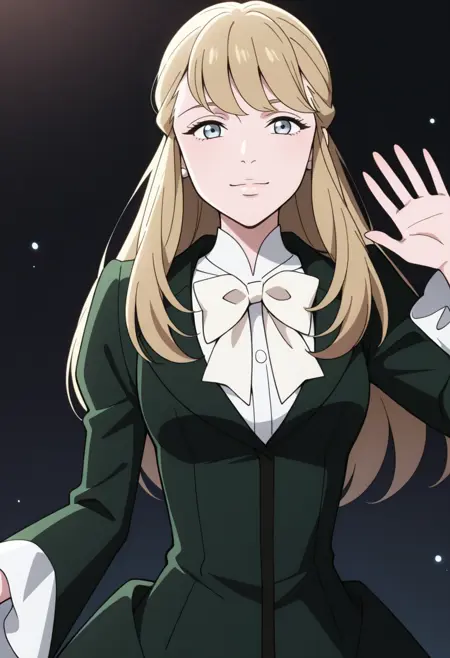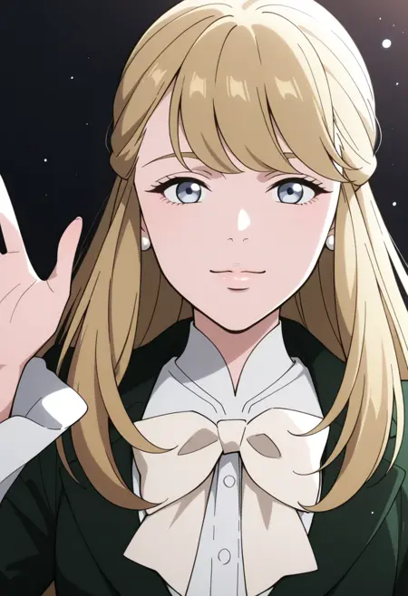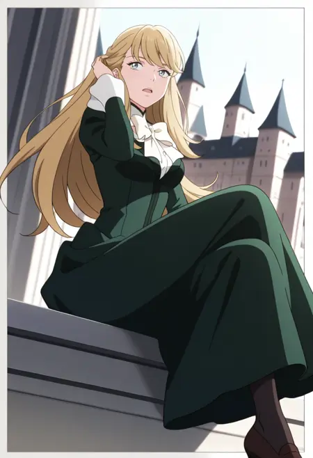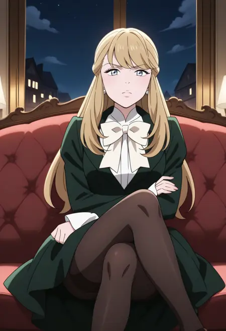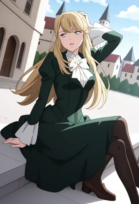 1girl, medium breasts, long blonde hair, light blue eyes, dark green long-sleeved dress worn over a white collared shirt, white ruffled collar, large white bow, black stockings, brown shoes, earing