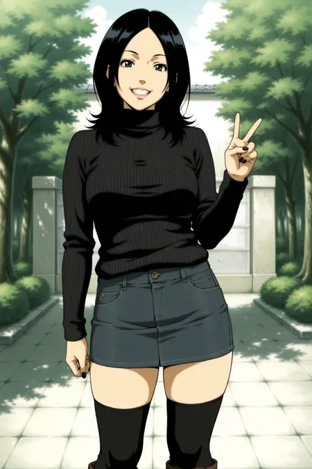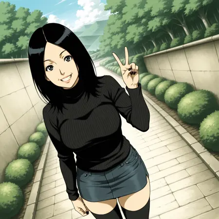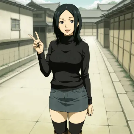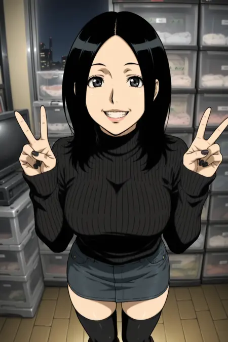Yukari_Kana,黑发,中长发,中分,自然风格,无刘海,黑眼,柔和烟熏眼妆,嘴唇,大胸,黑色指甲油,高领,黑色毛衣,条纹毛衣,长袖,牛仔裙,毛衣,黑色过膝袜,棕色靴子,微笑,闭嘴