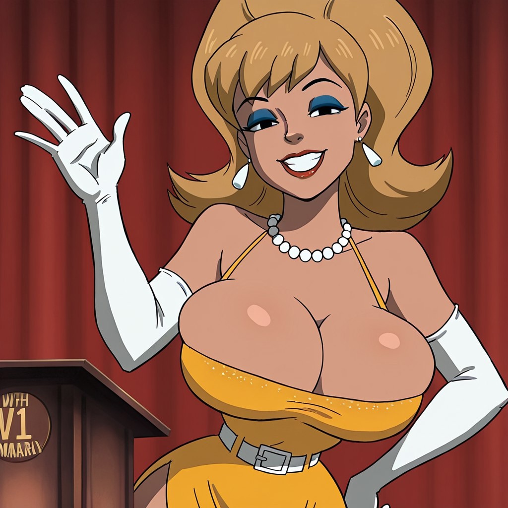 enormaray, brownish blonde hair, large hair, black eyes with white shine, blue eyeshadow, white elbow gloves, pearl necklace, white earrings, lipstick, blue eyeshadow, large breasts, cleavage, yellow slit dress with with white belt