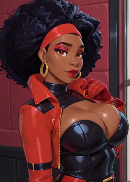 재킷, 빨간 장갑, 메이크업, 입술, 가슴, 보석, 장갑, 고리 귀걸이, 선글라스,
