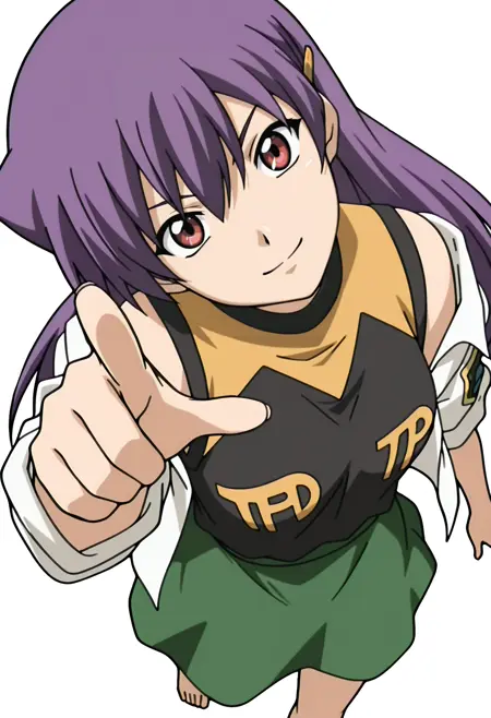 다색 티셔츠, 검은 티셔츠, 노란 티셔츠, 어깨 드러난 티셔츠, 벌거벗은 어깨, 흰 재킷, 열린 옷, 소매 말아올린, 녹색 치마, 진한 파란색 무릎높이 양말, 로퍼,