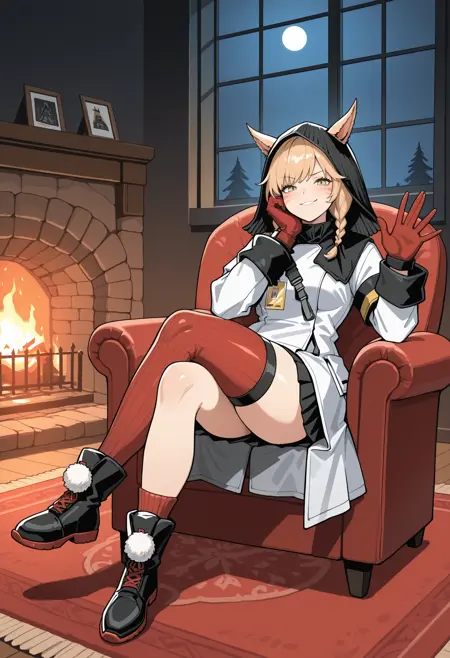 비대칭 하의, 부츠, 검은 치마, 빨간 양말, 빨간 장갑, 한쪽만 있는 빨간 히프하이, 흰 코트, 후드, 뽀뽀모 \(옷\), 신분증