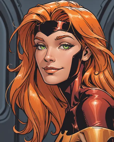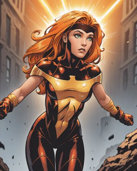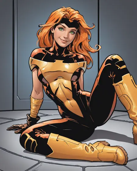 トリガー: _jeangreyrevolution, 1girl, オレンジ色の髪, 緑色の目, ボディスーツ, グローブ, ヘッドバンド, ブーツ