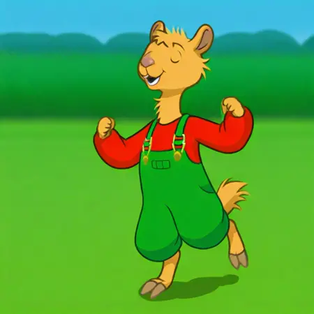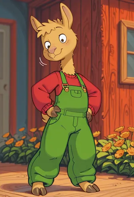 furry, furry male, llama, green overrals, red shirt