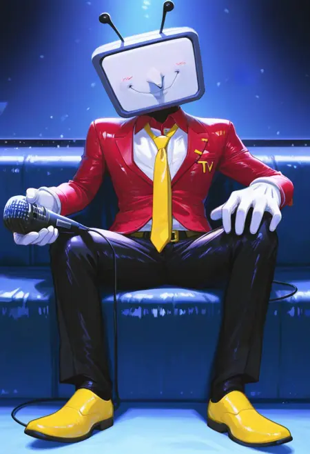 Tenna_DR, gloves, red suit, antennae, pointy_nose, no_eyes, yellow necktie, white shirt, black pants, 1boy, object_head, yellow shoes, belt buckle, emblem, loose necktie,