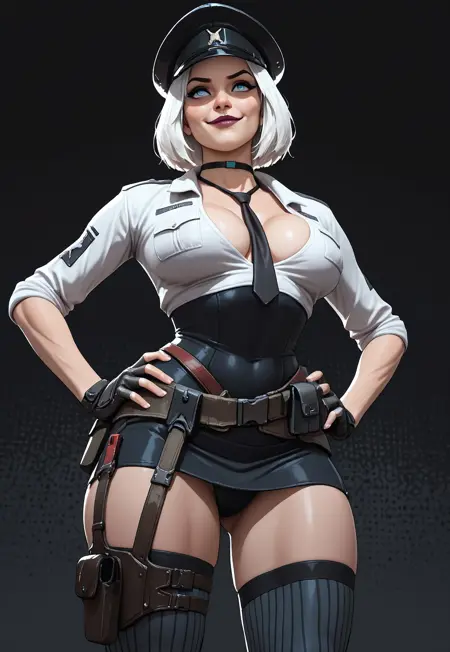 military hat, black choker, black necktie, necktie between breasts, cleavage, freckles on breasts, military uniform, collared shirt, sleeves rolled up, fingerless gloves, belt pouch, walkie-talkie, miniskirt, thigh strap, thigh holster, vertical-striped thighhighs, brown boots,