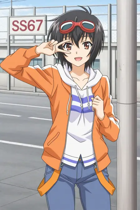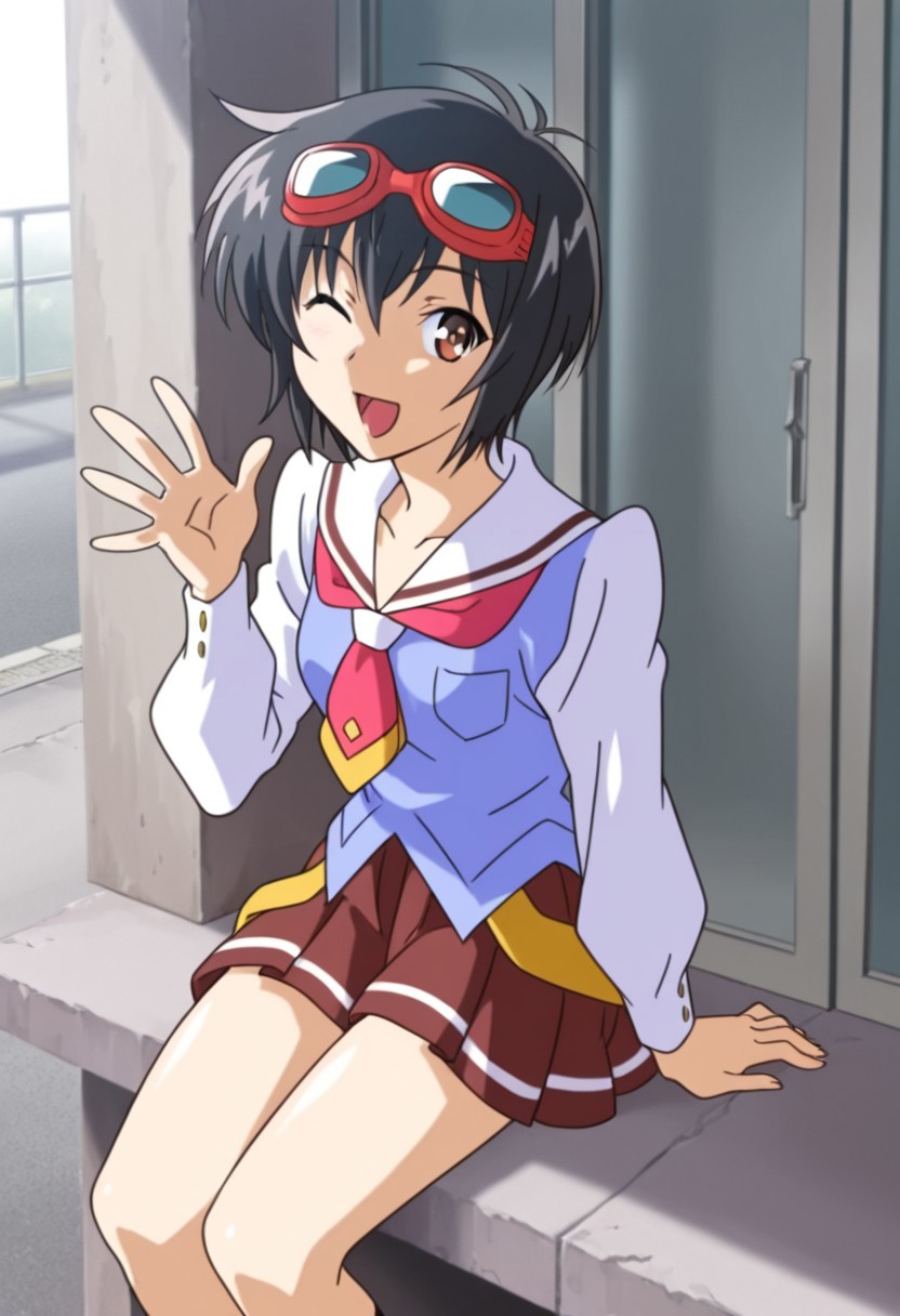 additonal prompts: 1girl, solo, brown_eyes, short_hair, skirt, black_hair, pleated_skirt, school_uniform, serafuku, goggles, black_socks, brown_skirt, goggles_on_head, red_neckerchief, white_sailor_collar