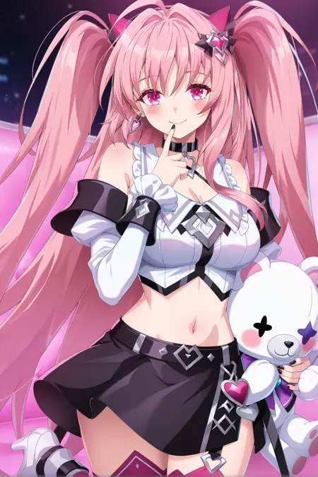 magenta eyes, pink hair, long hair, hair ornament, twintails, earrings, choker, medium breasts, white shirt, bare shoulders, detached sleeves, white long sleeves, navel, midriff, black nail polish, black skirt, magenta thighhigh, white high heels