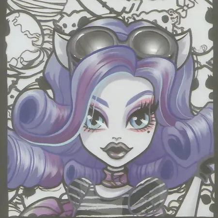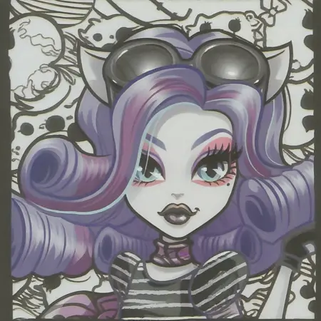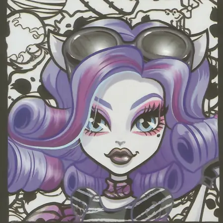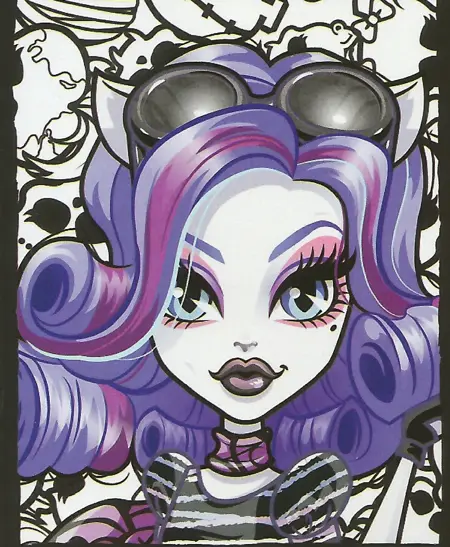 Catrine DeMew, pale white skin, cat ears, cat tail, long nails, pink nails, blue eyes, purple lips, cat nose, mole under right eye, two-toned hair, pink and purple curls (cat-like white skin), curls in hair