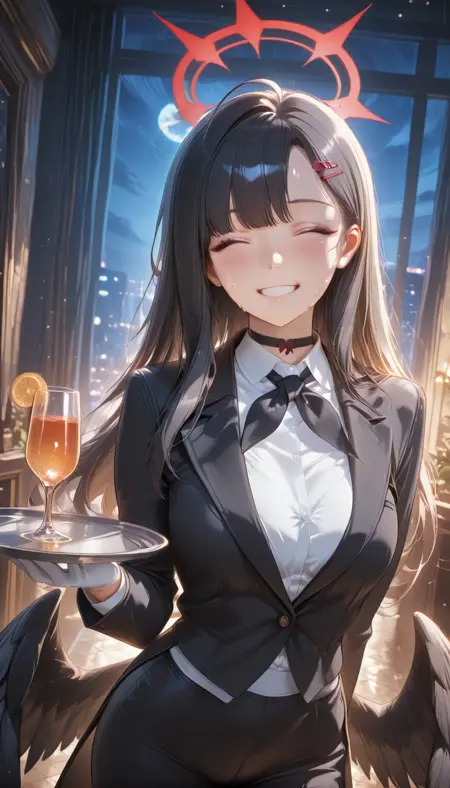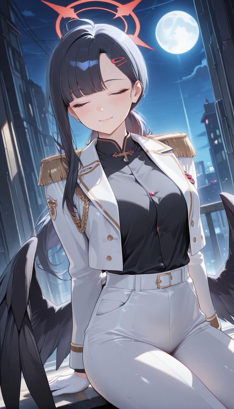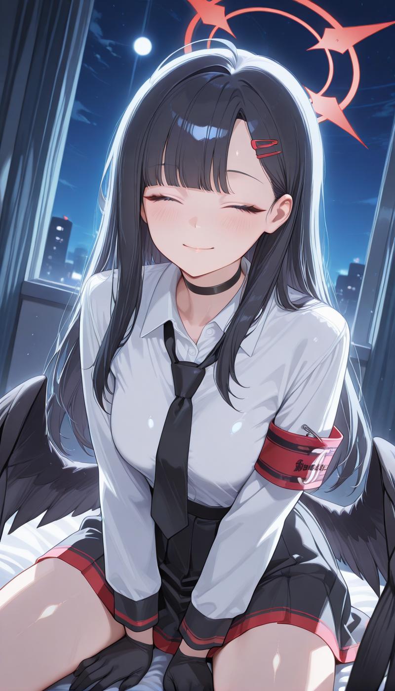BANakaIchi, long hair, black hair, hair ornament, closed eyes, ahoge, wings, hairclip, halo, straight hair, feathered wings, black wings, low wings, red halo, grey eyes, breasts,