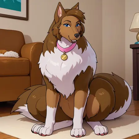 dog, rough collie, brown and white fur, fluffy fur, blue eyes, dog ears, fluffy tail, dog tail, pink collar, gold dog tag,