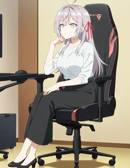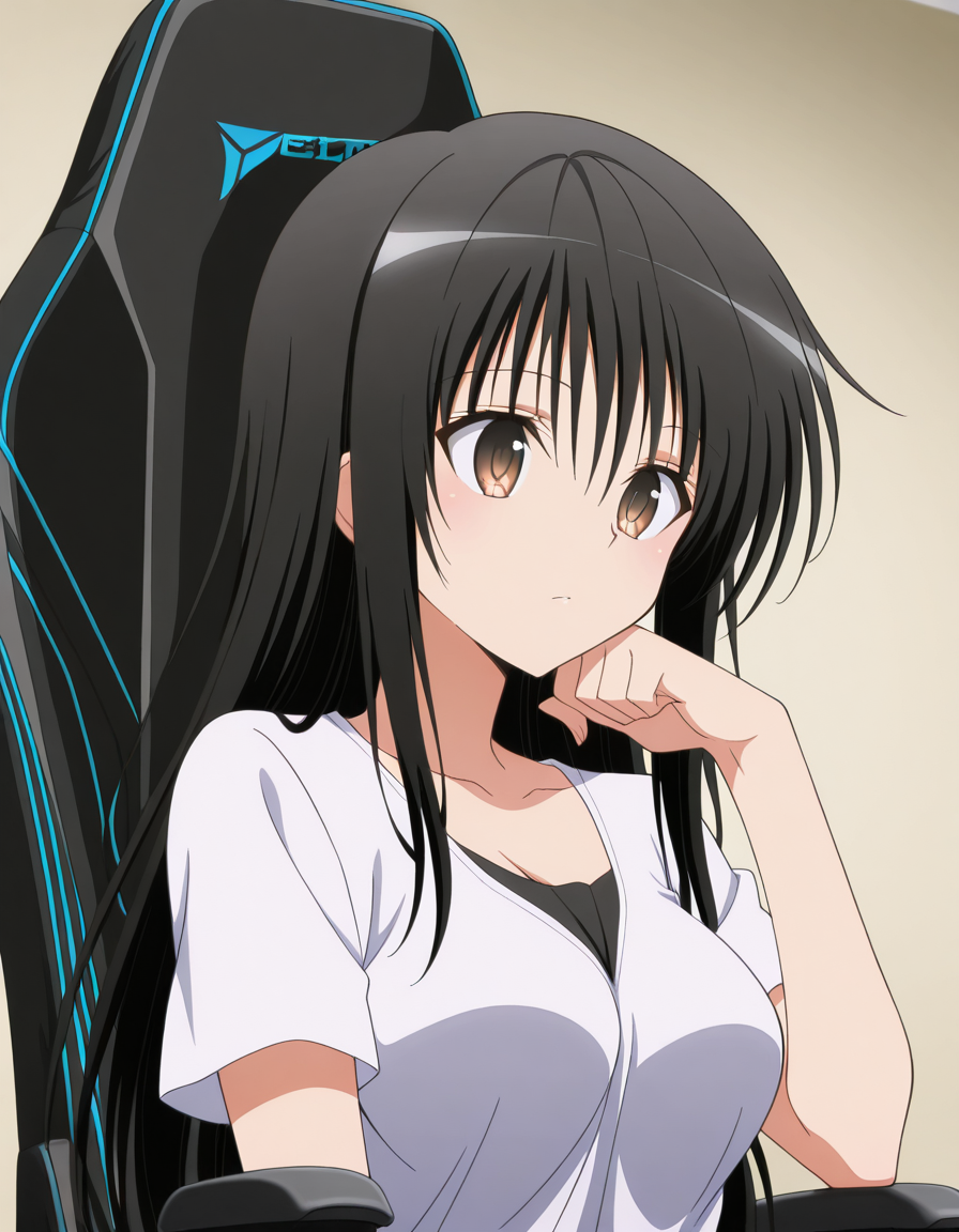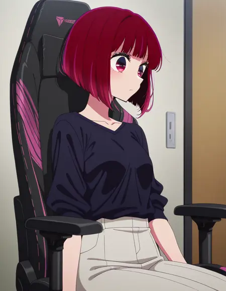 lora:secretlab-chair-illustriousxl-lora-nochekaiser:1, secretlab chair, chair, office chair, gaming chair, sitting, feet out of frame, elbow rest
