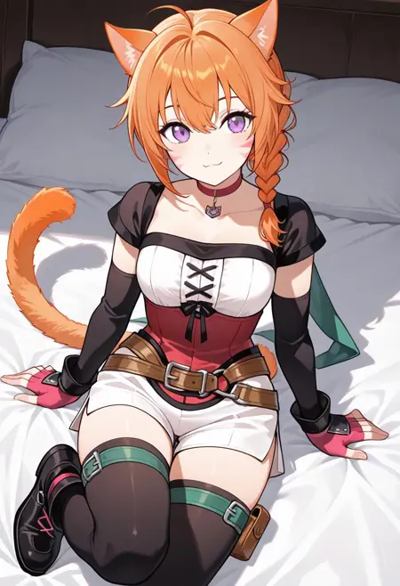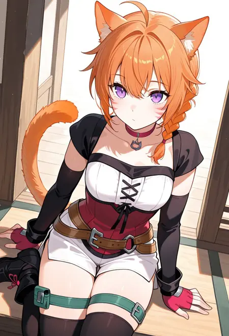 hair ornament, white kimono top, wide sleeves, dark trim, purple obi bow, pink hakama skirt, pleated skirt, pink and white zōri sandals, white tabi socks, blue beaded bracelet, orange cat tail with fluffy fur