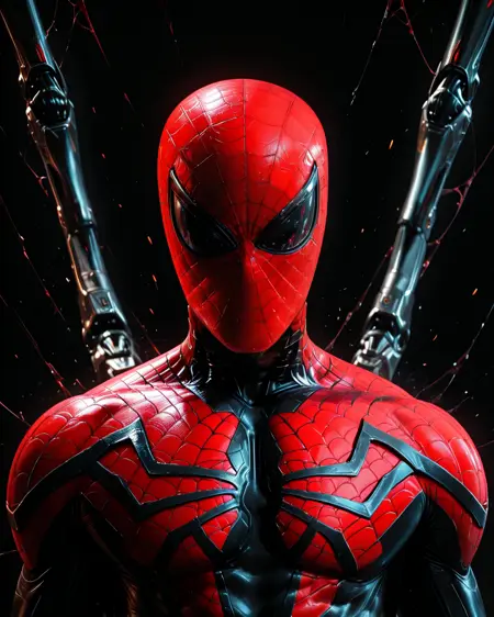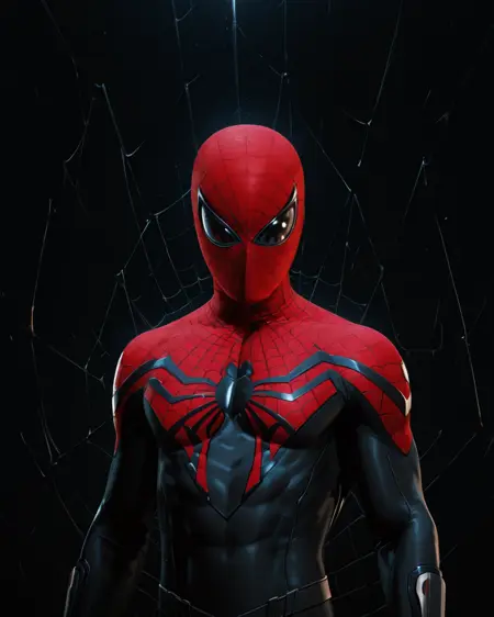 black and red suit, mask, no hair, no mouth, black eyes, on the chest there is a massive black spider logo