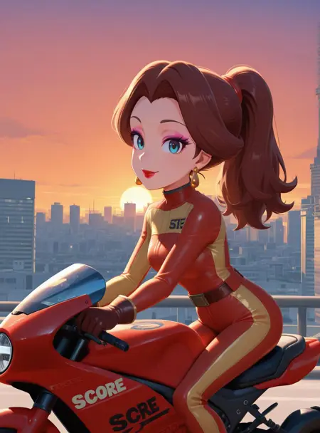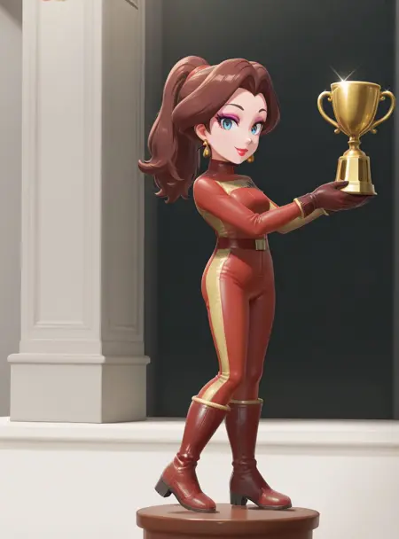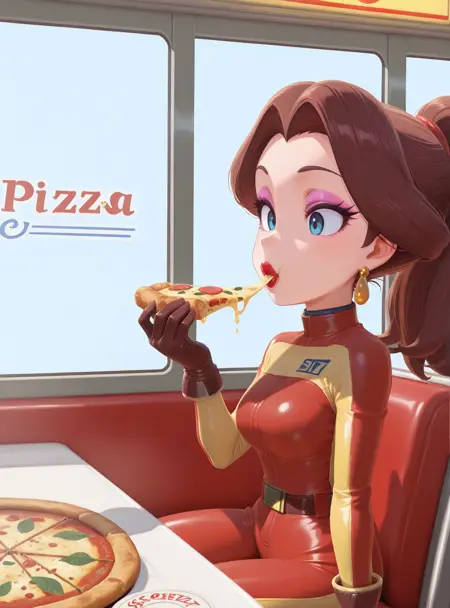 PaulineAeroMKW, brown hair,blue eyes, ponytail, earrings, bodysuit, gloves, multicolored clothes, lipstick, makeup