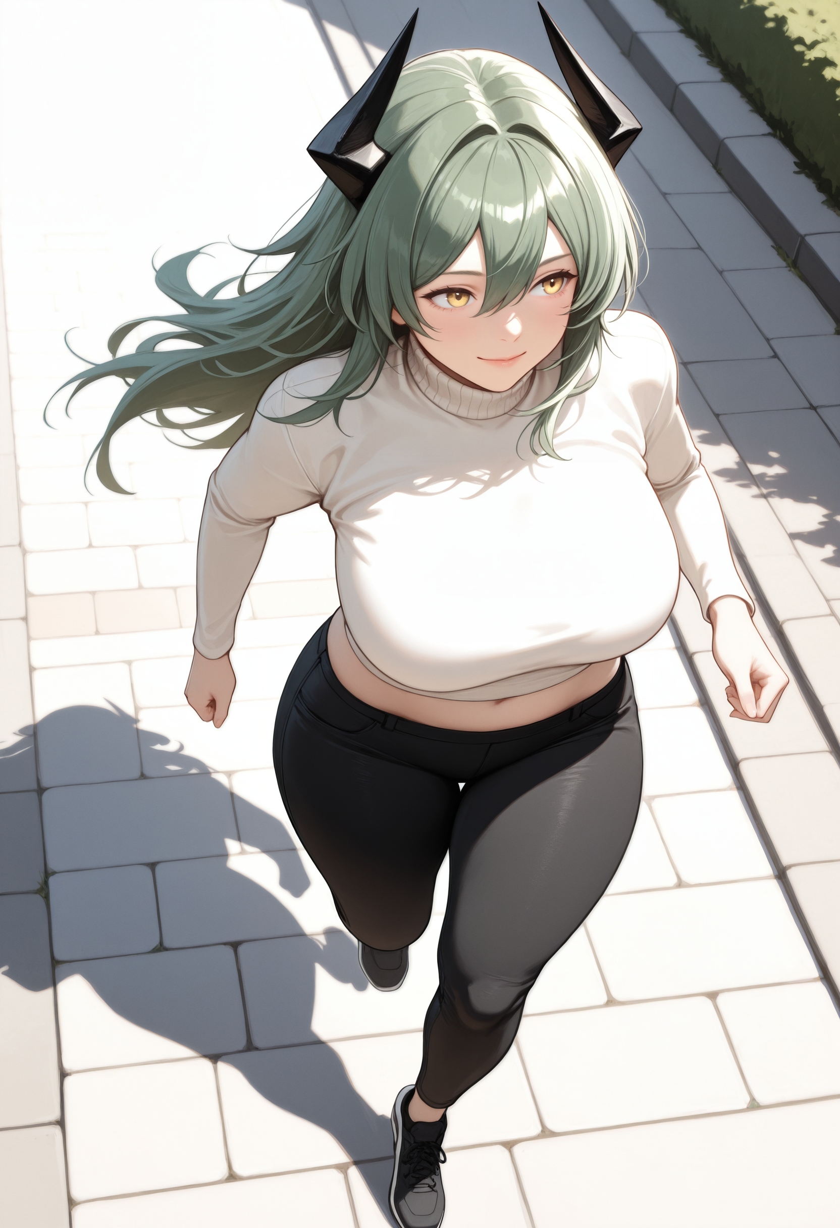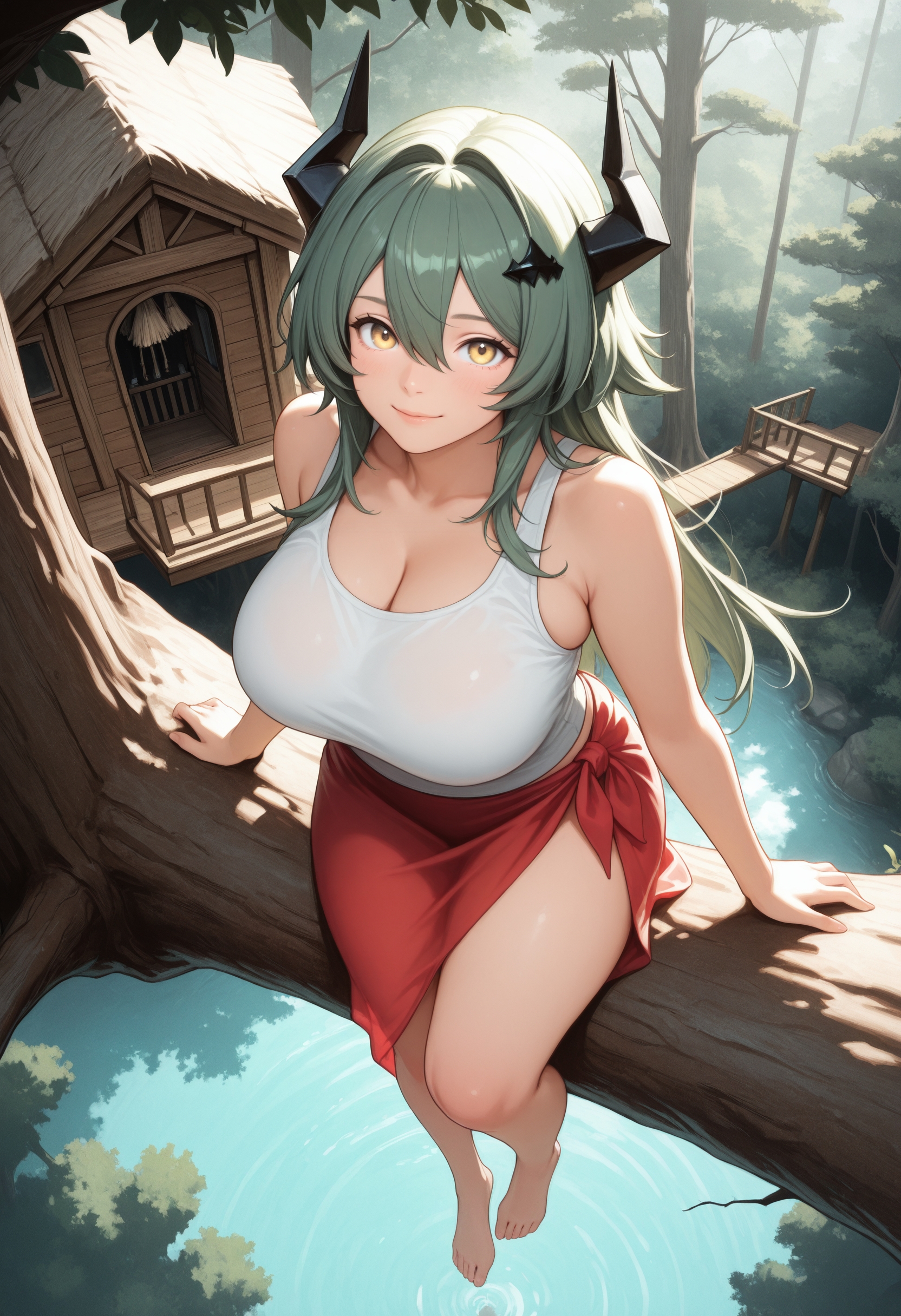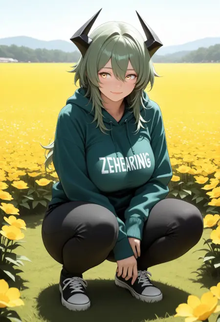 (Positive Prompts) zcaesarking, yellow eyes, black horns, large breasts, green hair, hair between eyes, long hair,
