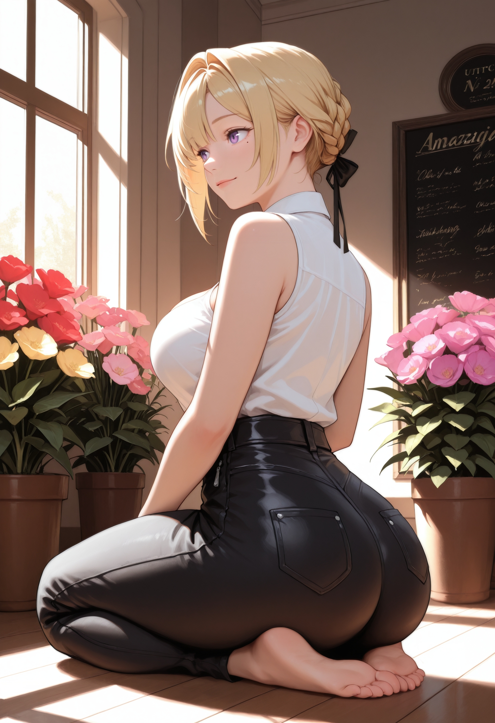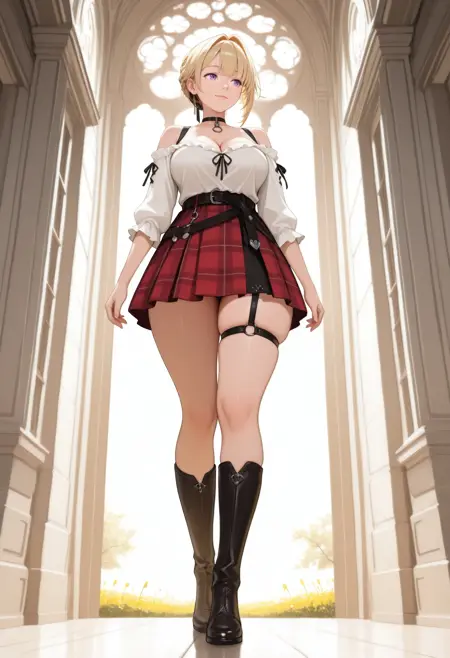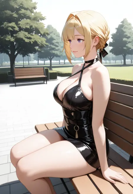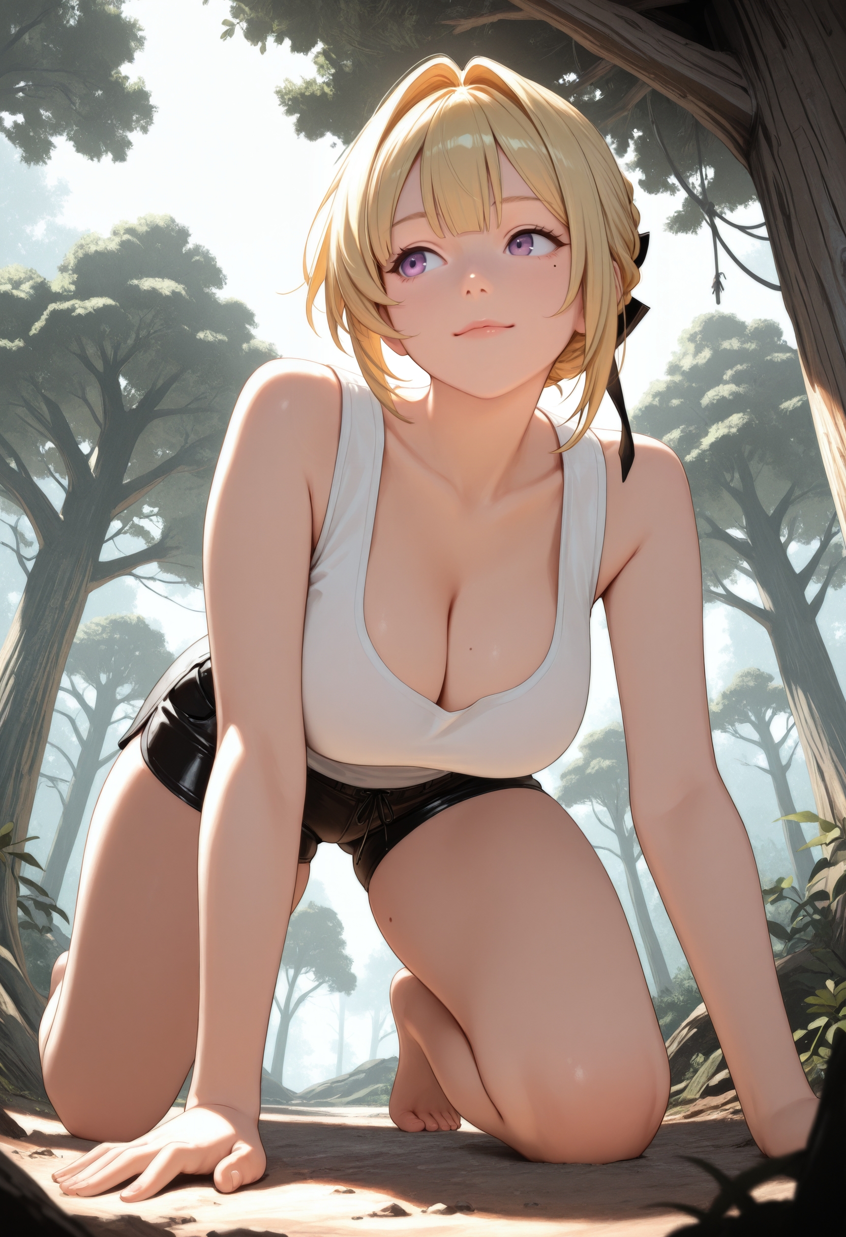 (Positive Prompts) zevelyn, large breasts, purple eyes, mole, mole under eye, blonde hair, short hair, uneven bangs, hair intakes,