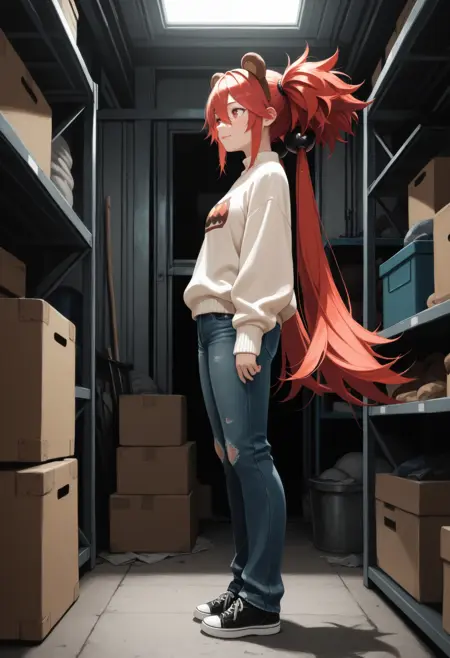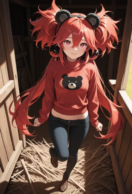 (正向提示词)zkoleda, 小胸, 红眼, 红发, 极长发, 双马尾, 侧发, 发丝遮眼, 假动物耳朵, 熊耳,