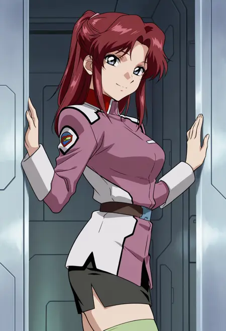 Base: fray_a, 1girl, anime coloring, retro artstyle, solo, long hair, ponytail, red hair, half updo, parted bangs, sidelocks, blue eyes, fray military uniform, pink jacket, black skirt, pencil skirt, miniskirt, long sleeves, belt, green thighhighs, thighhighs, zettai ryouiki, medium breasts,
