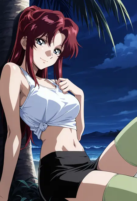 tank top: fray_a, 1girl, anime coloring, retro artstyle, solo, long hair, ponytail, red hair, half updo, parted bangs, sidelocks, blue eyes, tank top, tied shirt, white shirt. black skirt, pencil skirt, miniskirt, green thighhighs, thighhighs, midriff, navel, medium breasts