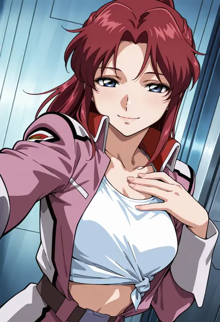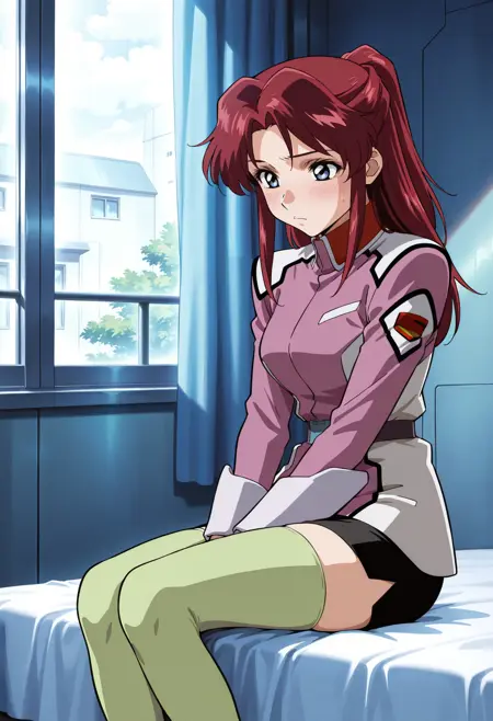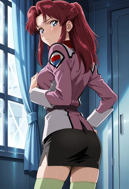 Base: fray_a, 1girl, anime coloring, retro artstyle, solo, long hair, ponytail, red hair, half updo, parted bangs, sidelocks, blue eyes, fray military uniform, pink jacket, black skirt, pencil skirt, miniskirt, long sleeves, belt, green thighhighs, thighhighs, zettai ryouiki, medium breasts,