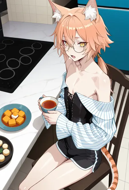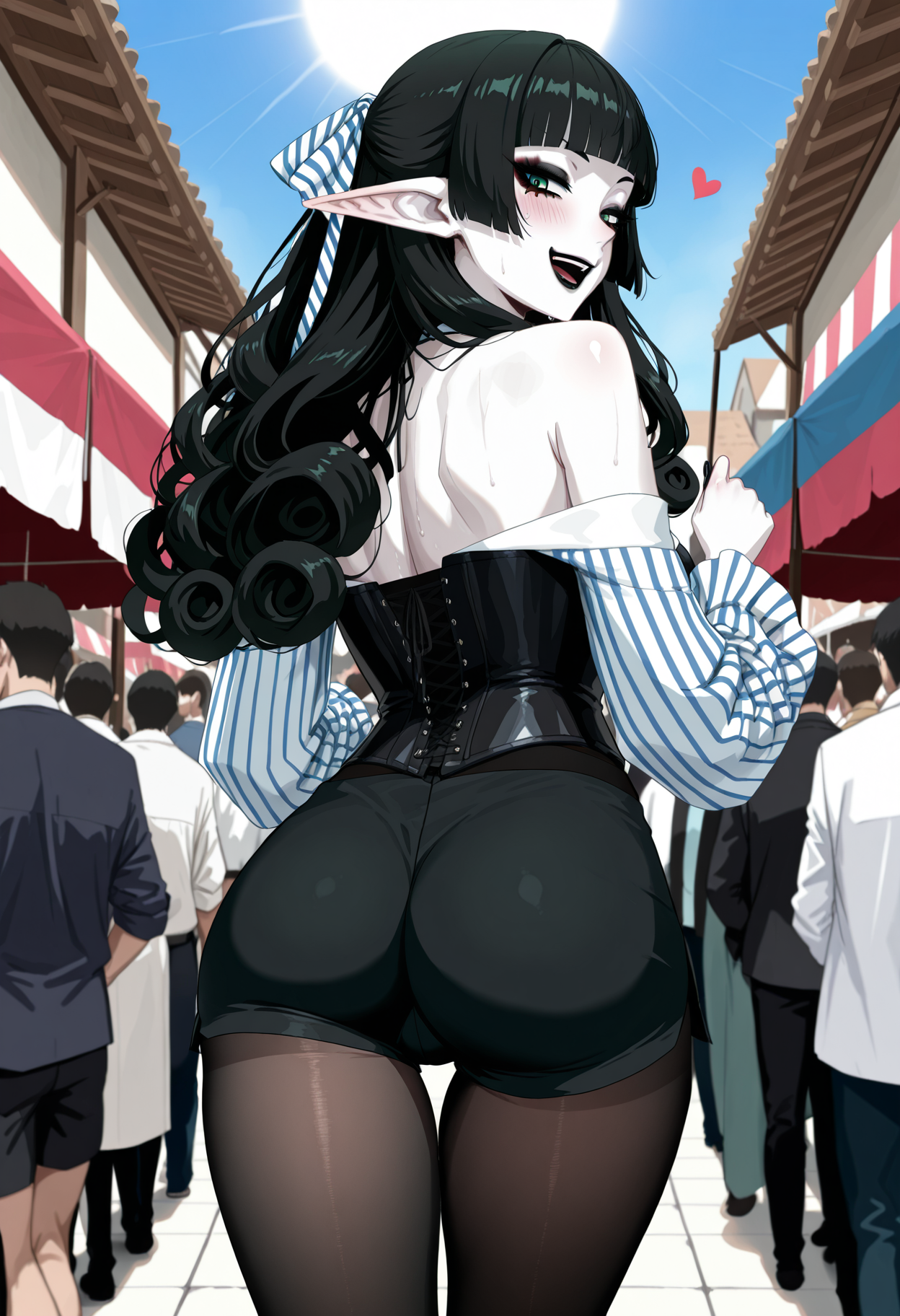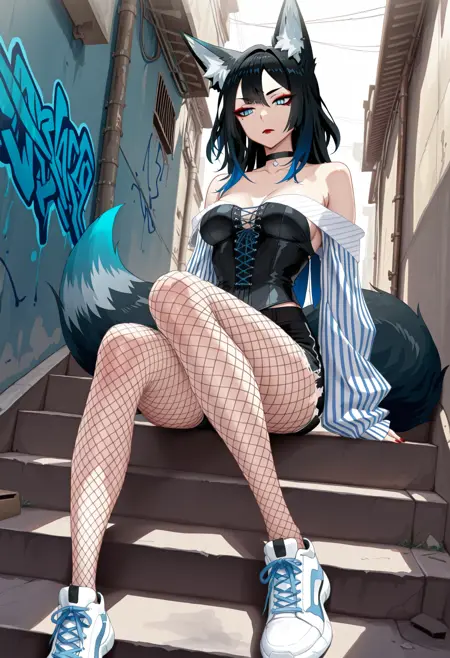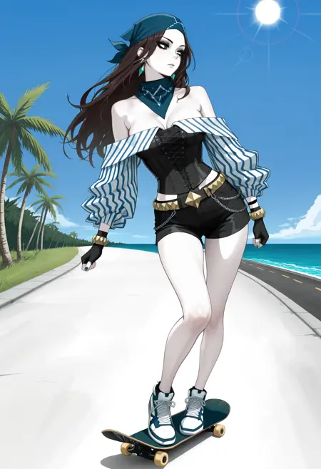 Triggered words: cryptographisuit, two piece suit, corset_top, short shorts, black shorts, striped sleeves, off shoulders, black corset, blue and white stripes,