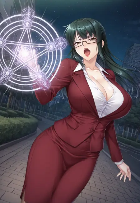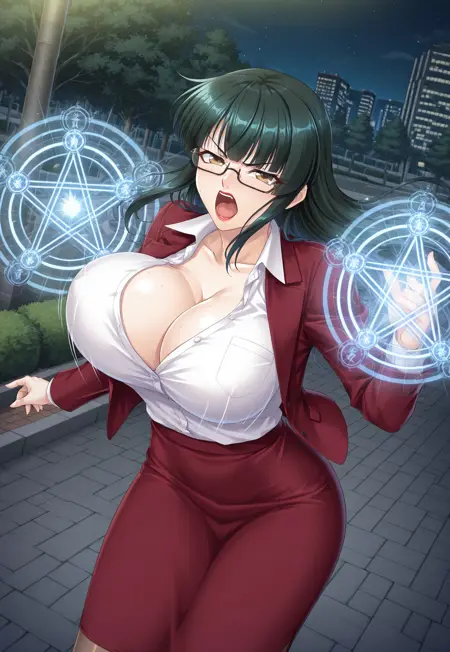 1st outfit: cleavage, formal clothes, skirt suit, red skirt, red jacket, white shirt, collared white shirt, pencil skirt, long sleeves, collared shirt, pantyhose
