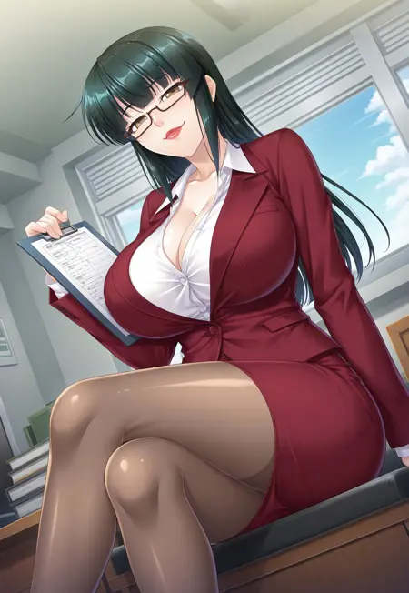 Tags: uehara kitae, brown eyes, hosome eyes, red lips, lips, dark green hair, long hair, blunt bangs, mature female, glasses, rim wear-glasses, under-rim eyewear, semi-rimless eyewear, large breasts