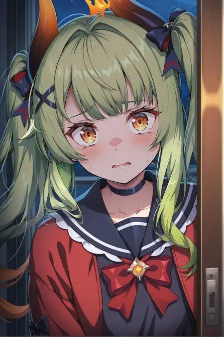 amber eyes, green hair, orange hair, multicolored hair, horns, hair ribbons, hair clip, twintails, choker, red bowtie, black shirt, red jacket, open jacket, thigh strap, pleated frill black skirt, black socks, black and red shoes