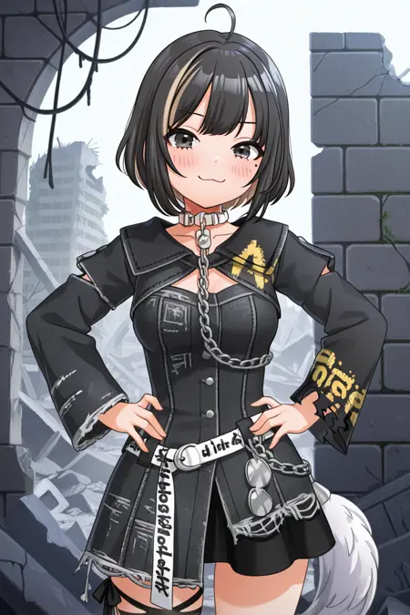 eimi, 1girl, solo, black hair, multicolored hair, streaked hair, dress, chain, breasts, :3, collar, tail, black dress, looking at viewer, ahoge, short hair, belt, blush, long sleeves, black eyes, ribbon, mole, smile, stgotf